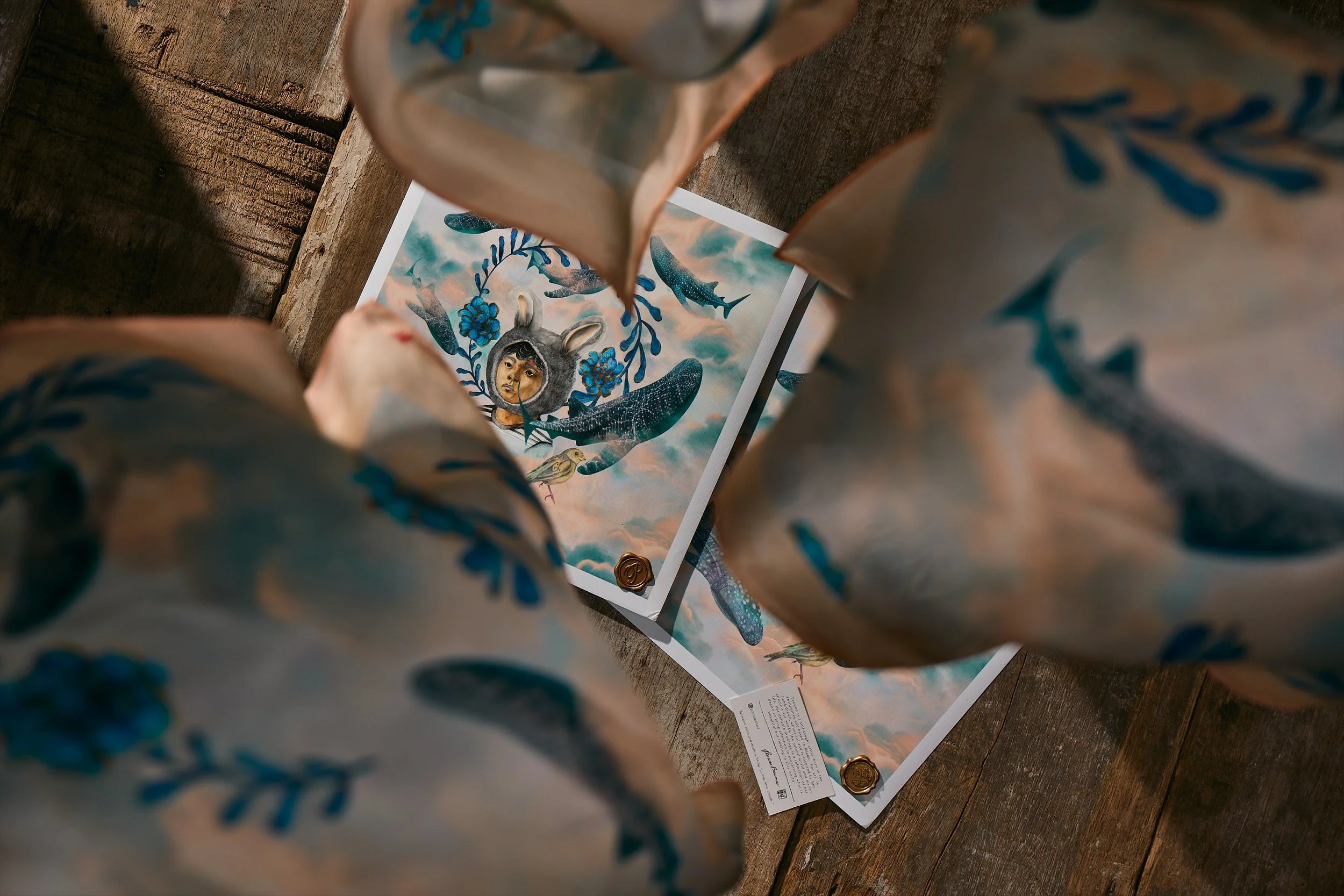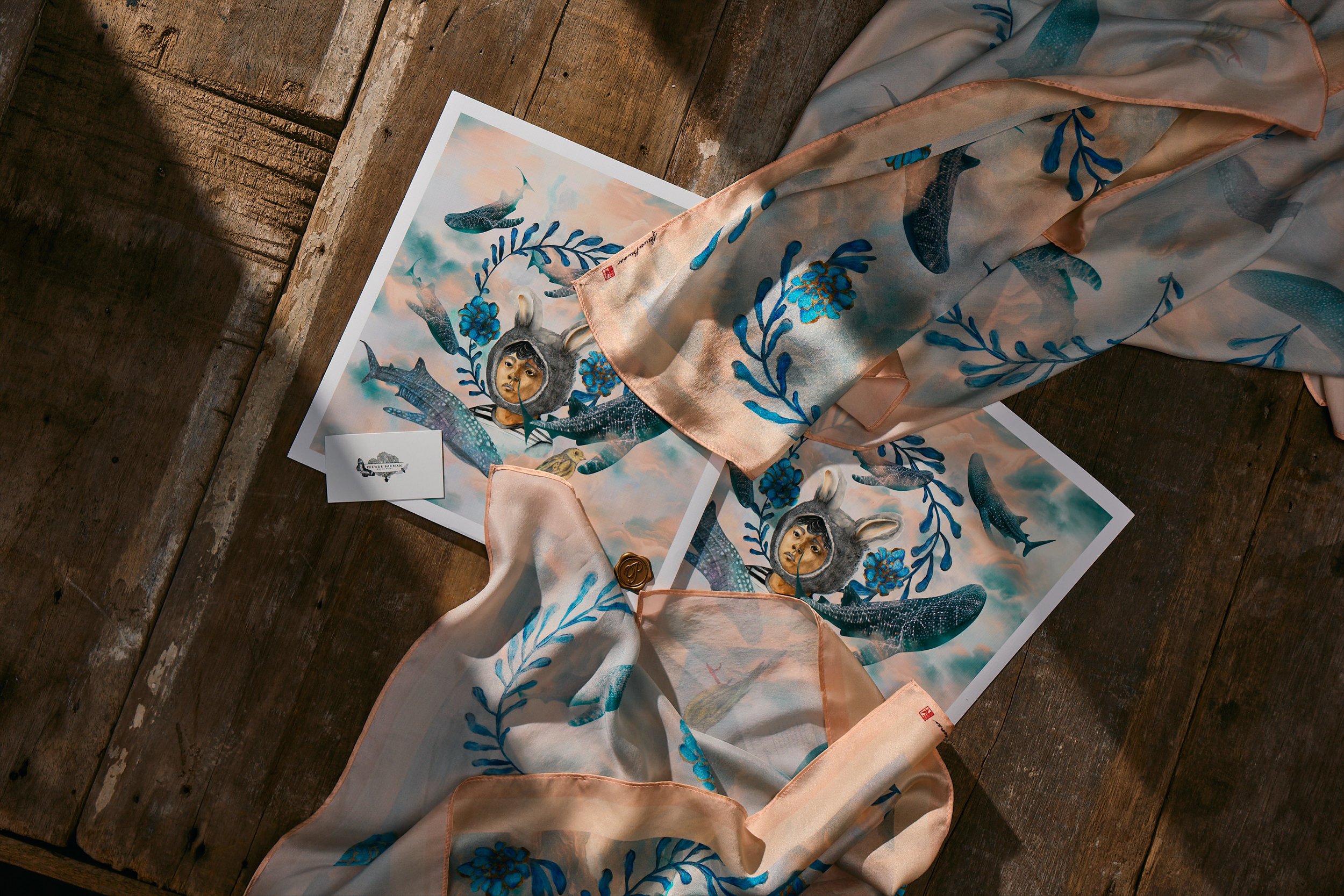 Lonely Boy & the Butandings is a collaborative artwork blending photographs by Filipino National Geographic Explorer Noel Guevara with PEEWEE’S hand-drawn interpretations. The piece is offered as a special-edition 12 × 12-inch linen archival print, paired with a limited-edition 60 × 60 cm scarf.